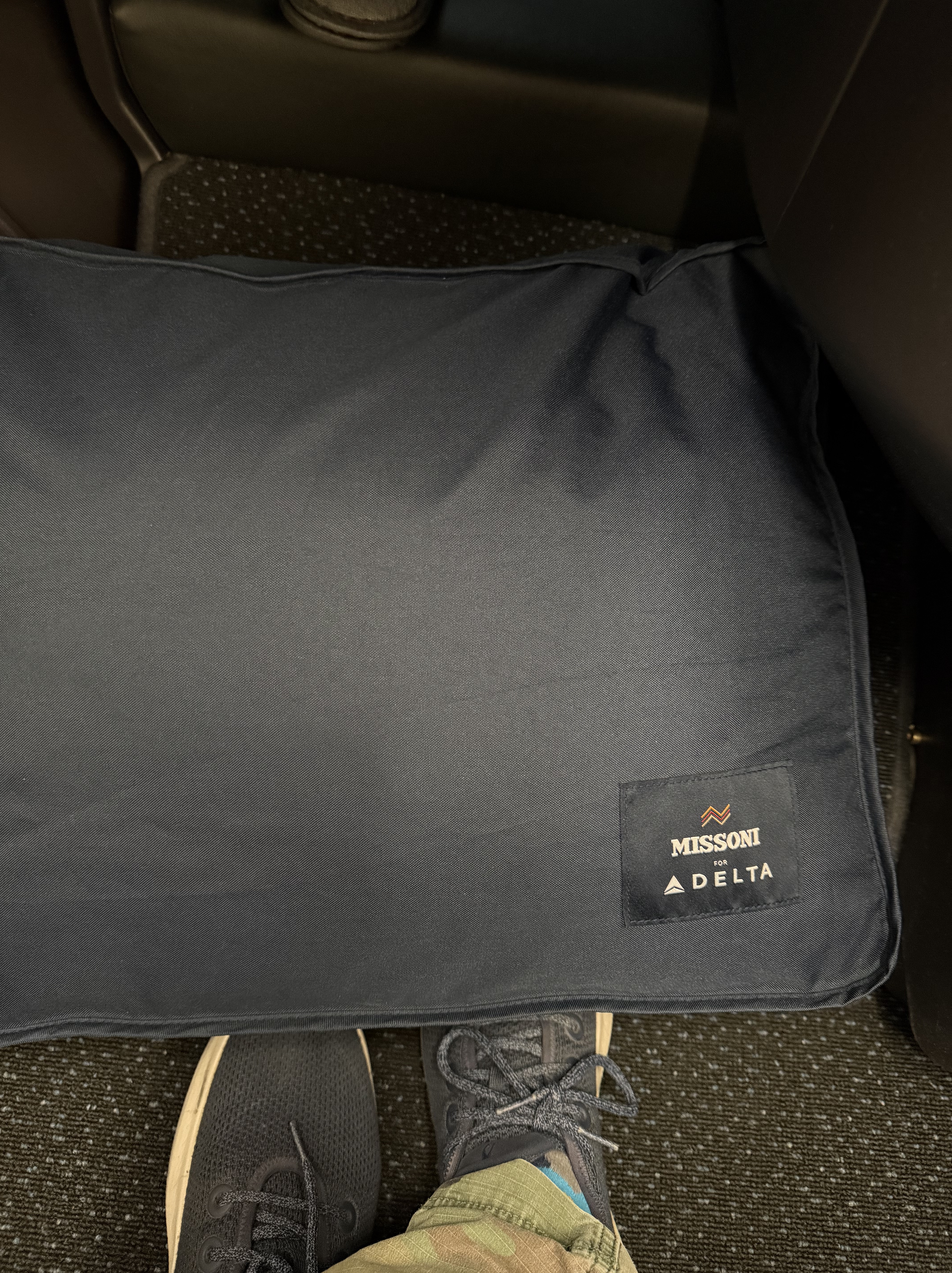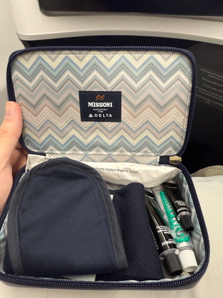 Delta has partnered with Missoni for its amenity kit. In my opinion, it’s a pretty standard affair with socks, toothbrush, toothpaste, hand lotion, face lotion, eye mask, and ear plugs. I do like the amenity kit itself though; I kept it and use it to store things I want to easily access during flights like electronic cords & power adapters and medications I might use during a flight, like ibuprofen.