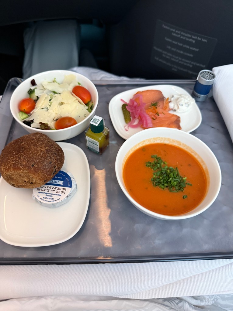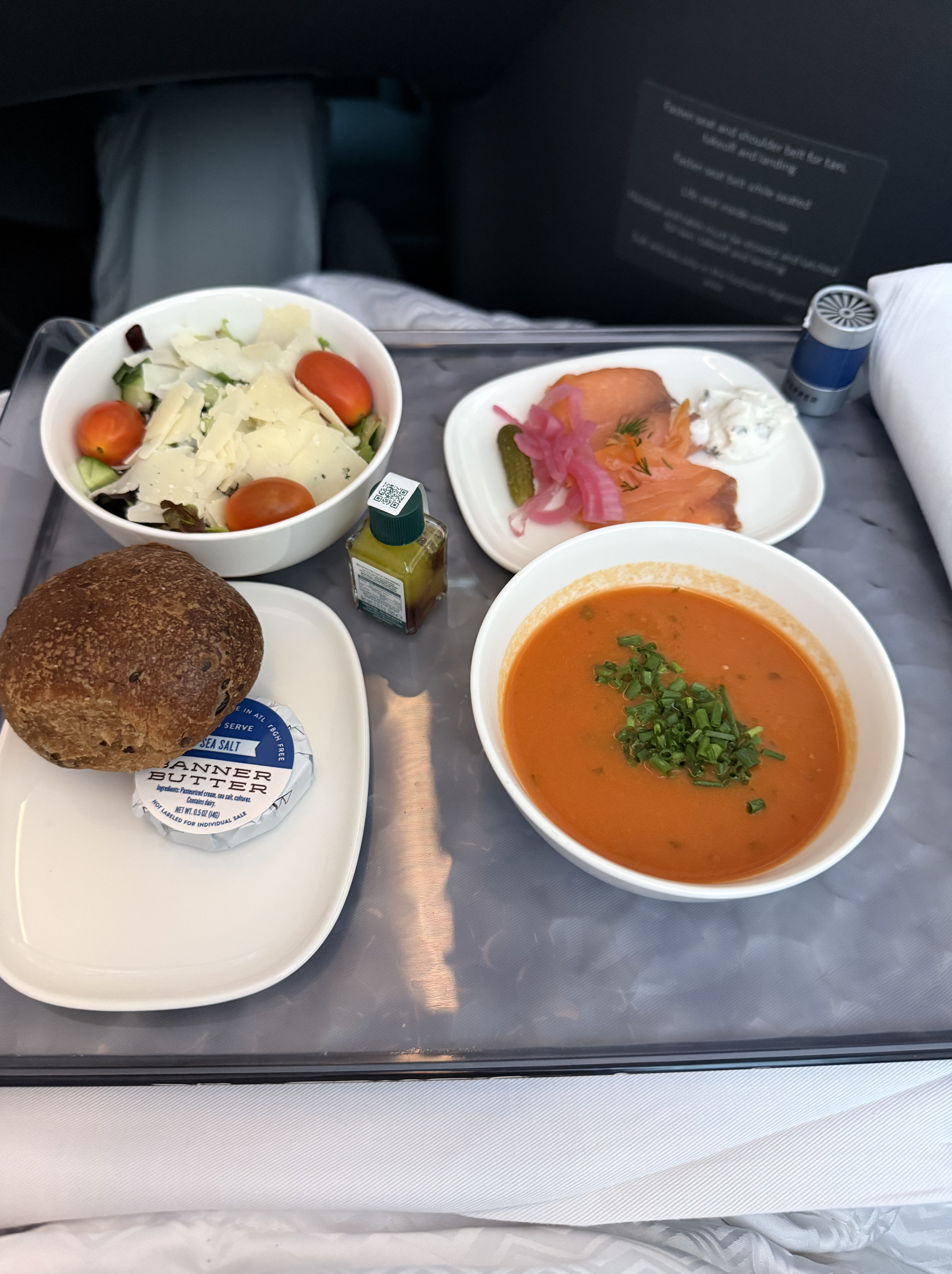 I was really looking forward to eating the crab cakes after people on reddit threads just seemed to absolutely rave about them. They were one of 2 exclusive pre-order options available for the route. Delta lets you pre-order your meal 7 days out, up to 24 hours from departure. After experiencing years of United catering, an airline that has acknowledged that it needs to step up its catering, I was really looking forward to seeing what people were so excited about. Maybe I built it up a bit too much in my head for my own good. The appetizer was a pretty delicious tomato bisque soup though I didn’t care for the salad or smoked salmon.
