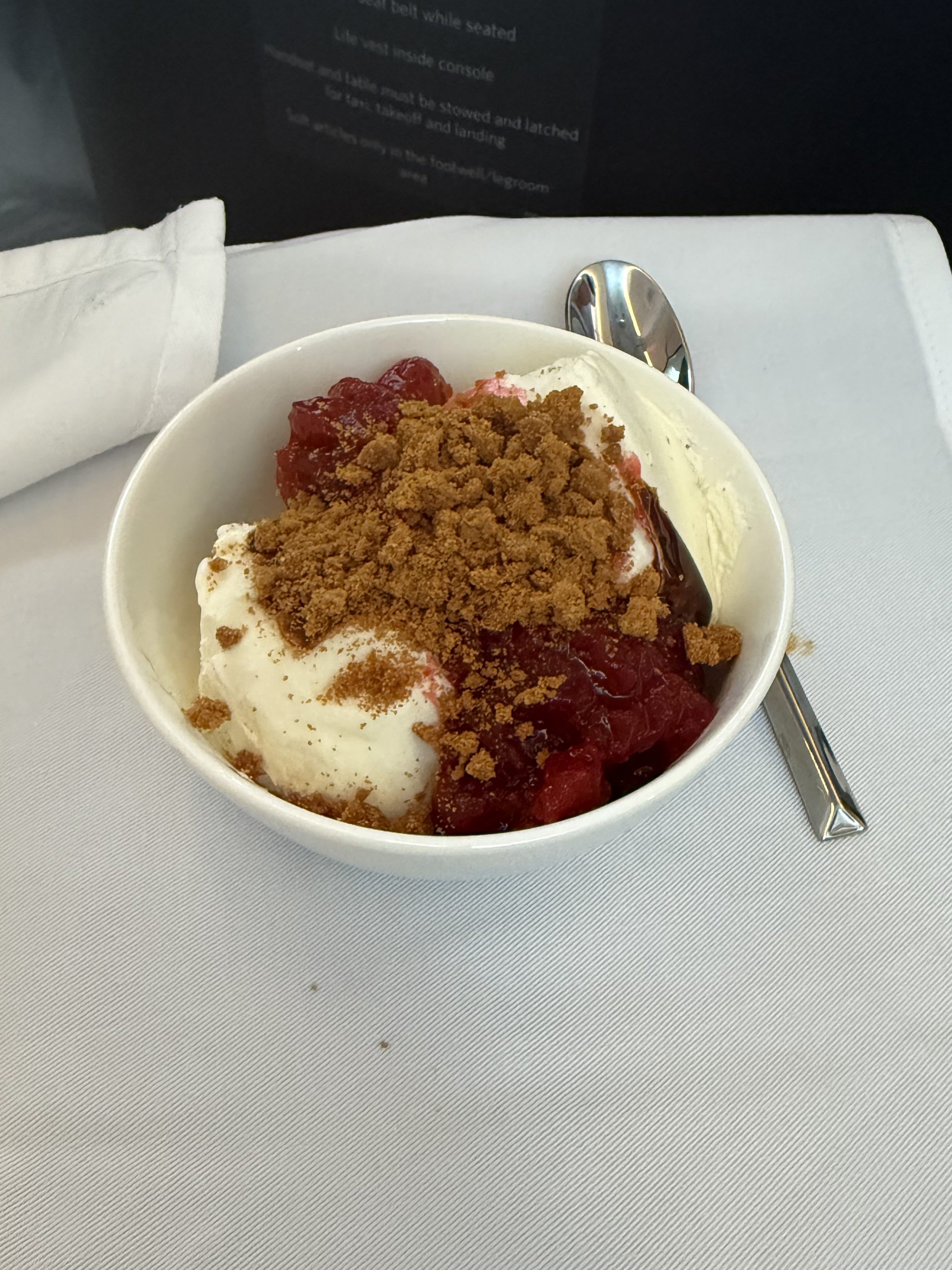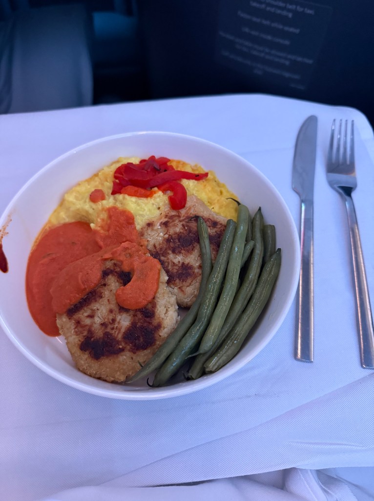 For the main course there were 5 options, though 2 of them had to be pre-ordered. The pre-order exclusives were crab cakes or meatballs (I’ve had the meatballs since then, and would absolutely choose them over the crab cakes). You could also pre-order the other options that were available on the flight: beef short rib, roasted chicken breast, or spinach cannelloni (a vegetarian option). If you are vegetarian I’d recommend pre-ordering the vegetarian option to avoid them running out. Personally, I tend to avoid chicken on flights as I find it is often dry.
