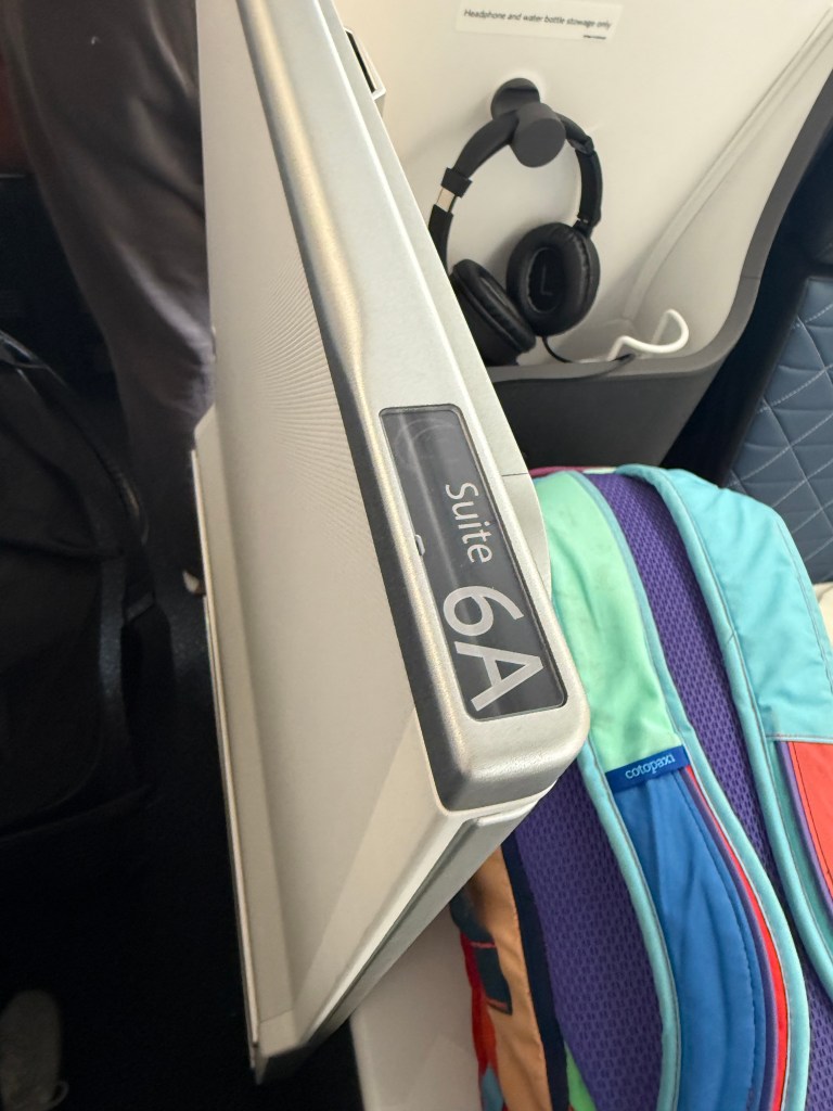 I didn’t really have a flight review in mind when I was taking these pictures, so I waited until the end of the flight to take the photo, and it isn’t the best shot, but you do get to see the fun colors of my backpack. I actually dislike that so many airlines seem to be moving to a very sterile aesthetic of lots of black and white; it reminds me of a medical clinic. When I initially boarded the mattress pad was kept in a nice container, and I have to say, the mattress pad was absolutely necessary for this seat. The seat was quite uncomfortable for me; it felt quite hard and the material the seat is made of is not very breathable. I think the flight crew would’ve helped me with the mattress pad if I’d asked, but I tend to avoid bothering them for things I can easily accomplish on my own. Once the mattress pad was in place, the seat was much more comfortable, both in the seated position and the lie-flat position. The seat controls felt intuitive to me (this is not my first business class flight), though I did find that I had to push quite hard for the controls to recognize what I wanted the seat to do. I think I prefer physical buttons over a touchscreen style when it comes to seat controls; they always seem to work better and more easily.